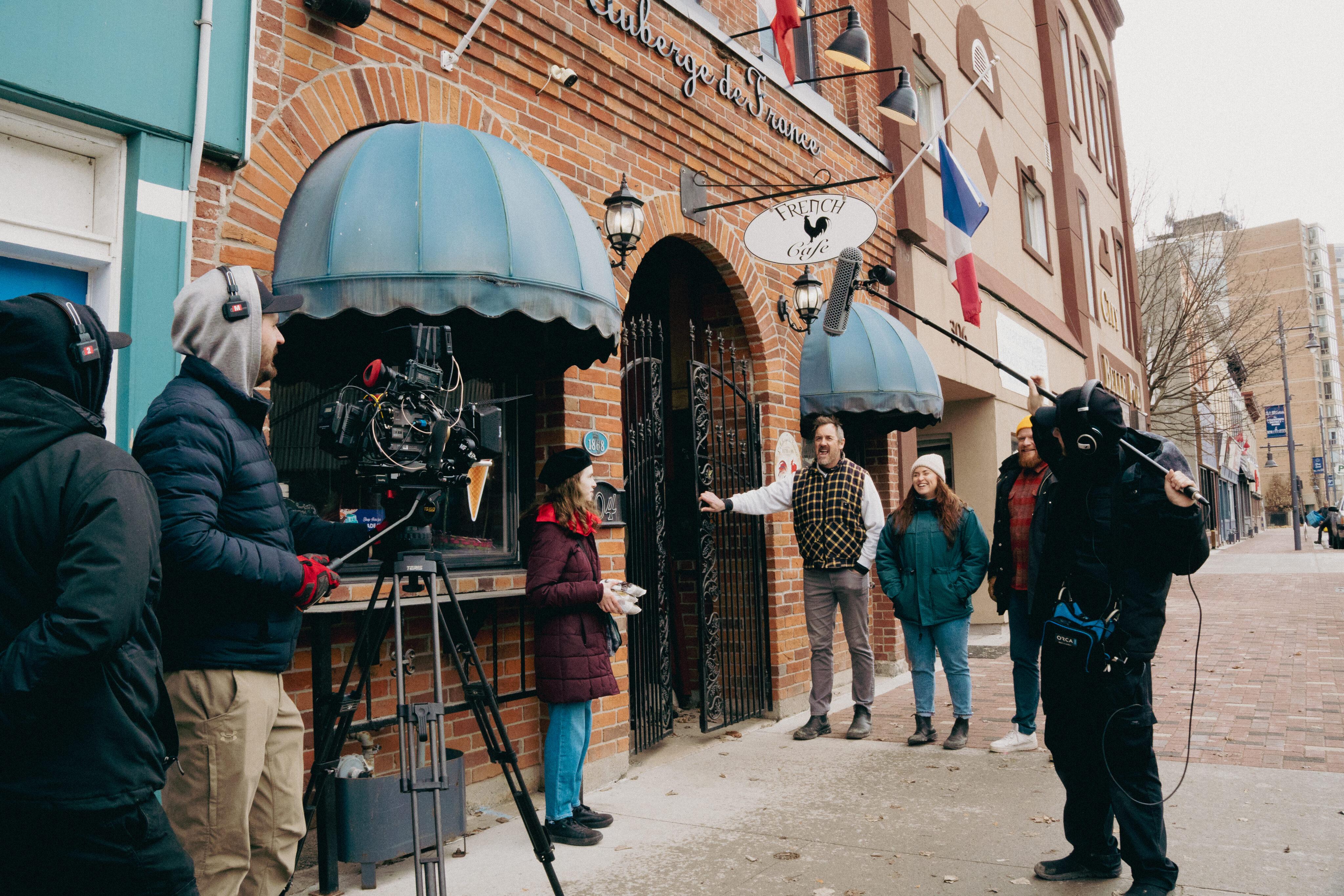 Filming taking place outside downtown belleville restaurant, L'Auberge de France.