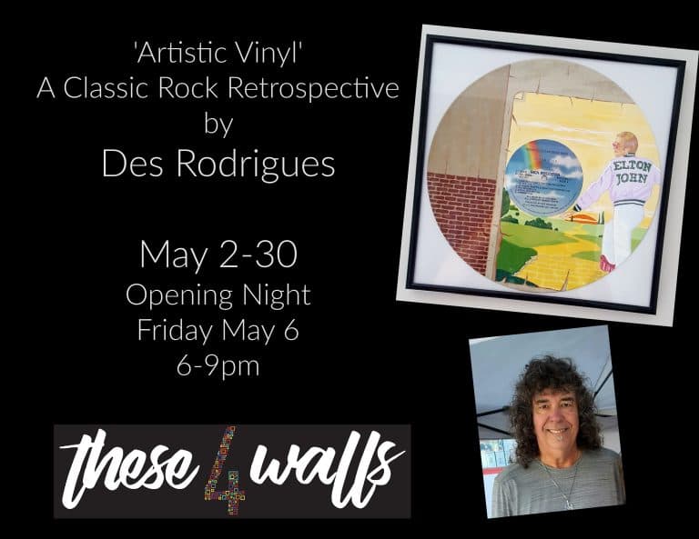 Please stop in during the month of May to experience this colourful and surprising ‘Artistic Vinyl’ Classic Rock Retrospective exhibit by the talented Des Rodrigues. Opening Night May 2 from 6-9pm.