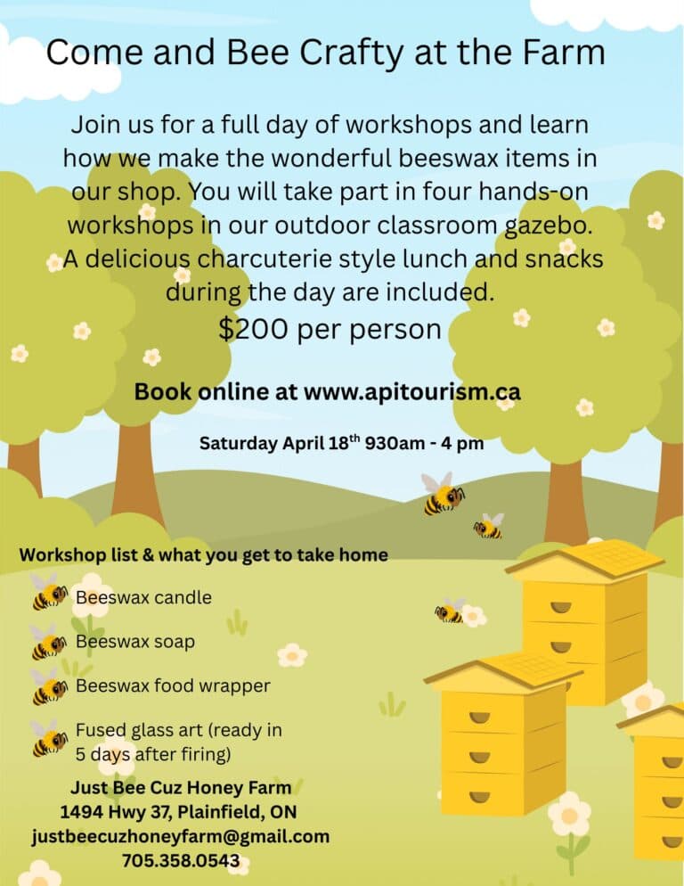 Join us for a full day of workshops and learn how we make the wonderful beeswax items we sell in our shop. You will take part in four hands-on workshops in our outdoor classroom gazebo. A delicious charcuterie-style lunch and snacks during the day are included. Workshops that will be taught are making beeswax candles, how to make beeswax food wrappers, how to make artisanal beeswax soap, how to make a unique one-of-a-kind fused glass art piece. Take homes will include a beeswax candle, a beeswax food wrapper, a bar of beeswax honey soap, and a beautiful fused glass votive holder. This wonderful Bee Crafty Day is taking place April 18th 930 am to 4 pm.