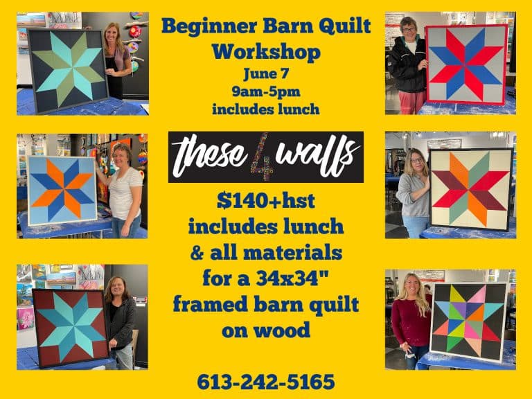 Our Beginner Barn Quilt Workshops Are Back! Book yourself and your friends for a fun filled day of creating your very own Barn Quilt 34×34″