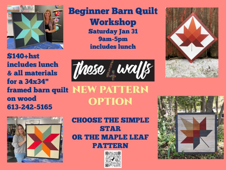 Choose **1 of 5 stunning Barn Quilt designs layouts** and customize the colours to perfectly match your home or décor. Choose the simple star or the maple leaf when you select your tickets. There is a slight difference in the carpentry between the 2 options, so please choose accordingly. Finished size is 34×34 for both options.