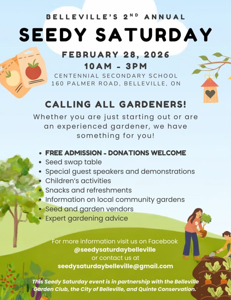 Seedy Saturday is a community event for the sharing of seeds and gardening expertise. The event is sponsored by the City of Belleville, the Belleville Garden Club and Quinte Conservation. Local community groups and market vendors include: Gleaners, Community Development Council (community gardens), Natural Themes Nursery, TerraEdibles, DropSeed Nursery, Fiddleheads Farms, Thyme Again Gardens, Master Gardeners and more.
