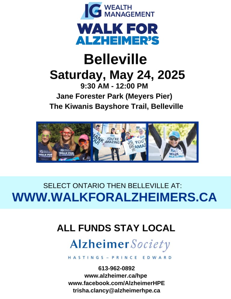 Join us for the Belleville IG Wealth Management Walk for Alzheimer’s on Saturday, May 24th at Jane Forrester Park, walking the Bayshore Trail. Registration opens at 9:30 am and the Walk is from 10 am – 12 pm. Everyone welcome to attend this free public community event. No cost to attend or participate. Register and fundraise online at www.walkforalzheimers.ca or learn more at www.alzheimer.ca/hpe.