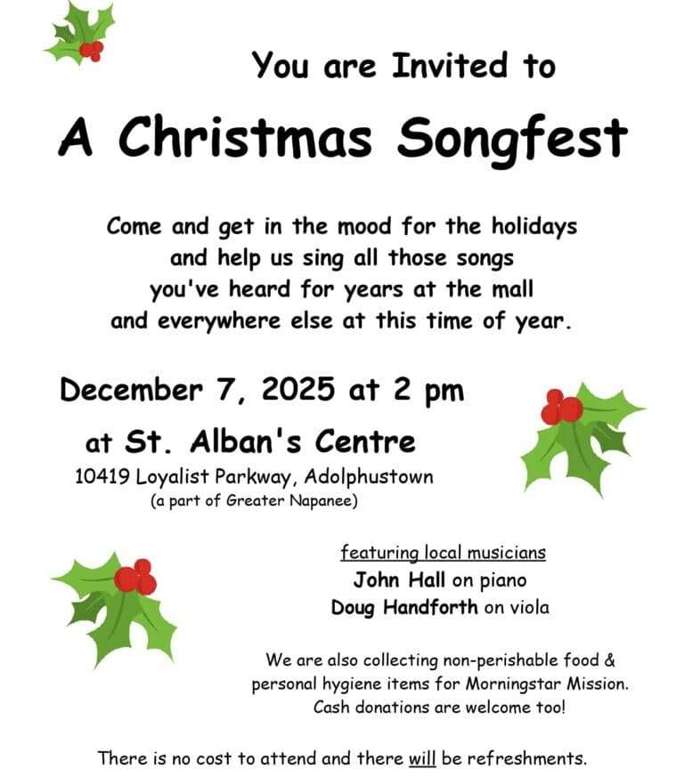 You are invited to come and get in the mood for the holidays and help us sing all those songs you’ve heard for years at the mall and everywhere else at this time of year. Song sheets are provided with lyrics, musicians will be on hand to supply the accompaniment and there will be seasonal refreshments provided afterwards.