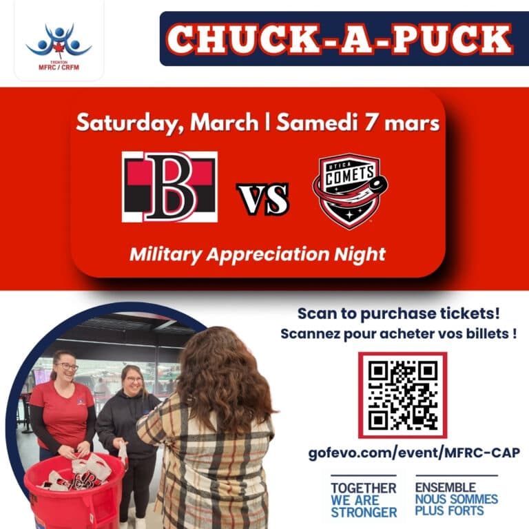 Invite a friend, bring visiting family, or rally your team or crew for a fun night at the rink — and don’t forget to take part in Chuck-A-Puck for your chance to win while supporting a great cause. Purchase your tickets through the Trenton MFRC by clicking the link below. Military members and community members are all welcome to buy through this link — everyone is invited!