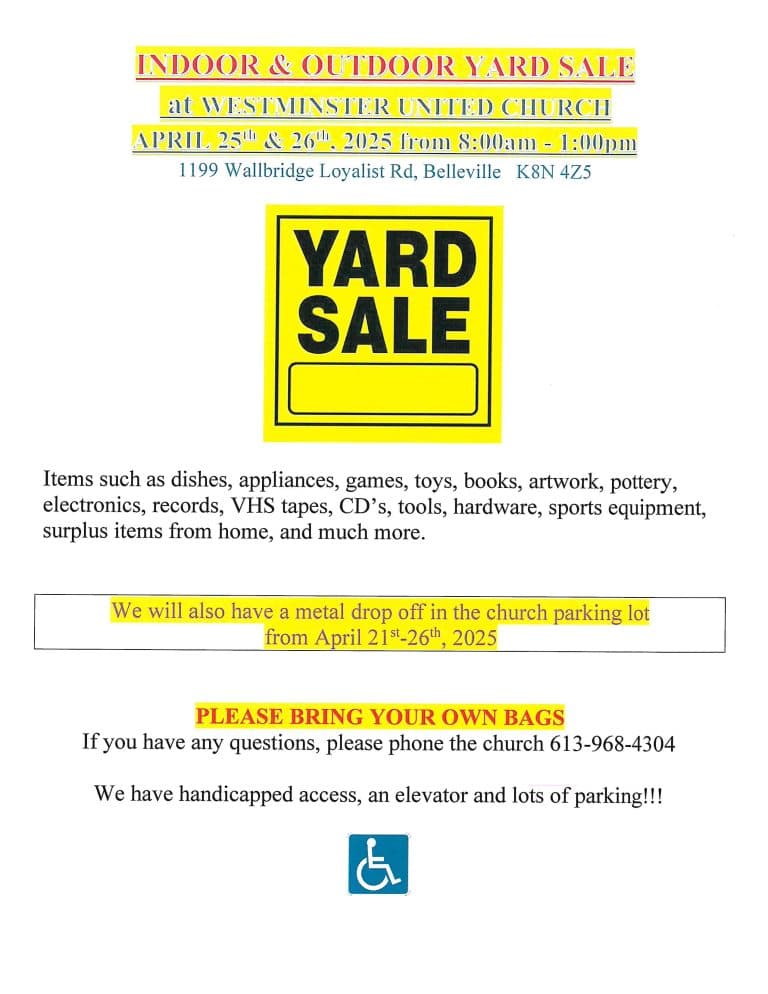 Indoor/Outdoor Church Yard Sale on Friday, April 25th & Saturday, April 26th, 2025, from 8:00am-1:00pm each day at Sidney Westminster United Church, 1199 Wallbridge Loyalist Road, Belleville, ON, K8N 4Z5.