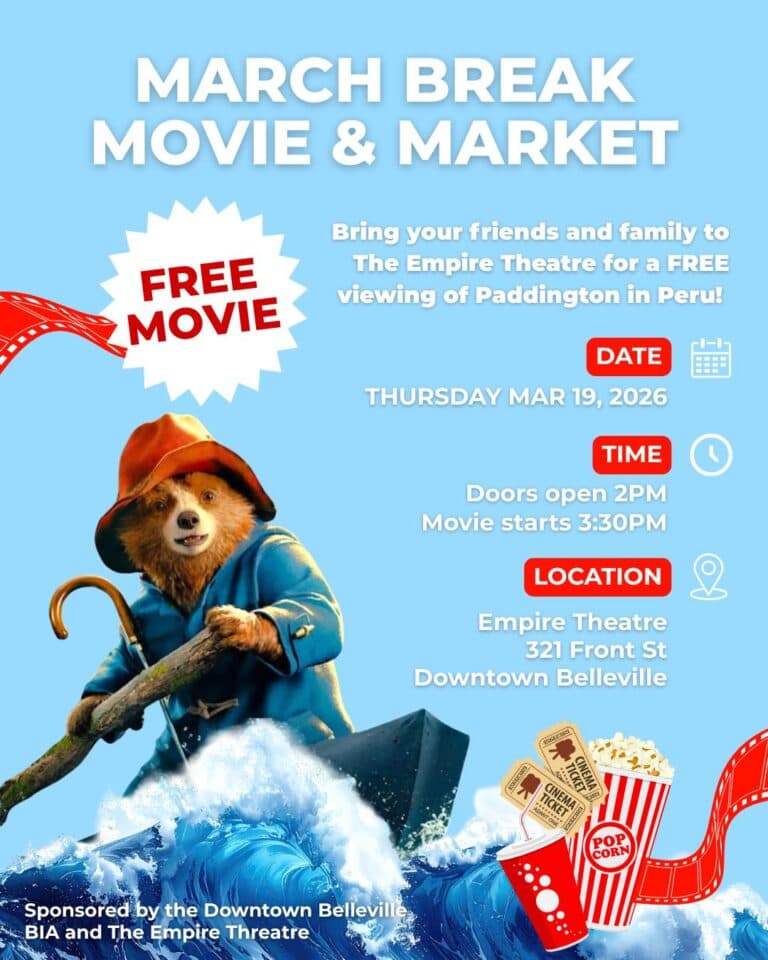 Downtown Belleville and Empire Theatre present March Break Movie & Market! Browse local market vendors like Doki Doki and Tinkered Decor at the Empire Theatre before settling in for a FREE screening of Paddington in Peru.