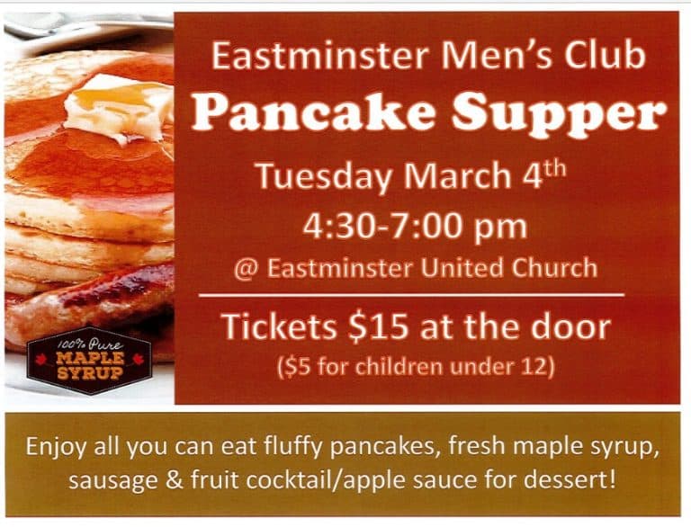 Please plan to attend the Eastminster United Church Men’s Club Pancake Supper on March 4th, 2025 from 4:30PM to 7:00PM. Pancakes, maple syrup, sausage with fruit cocktail or apple sauce for dessert. Tickets are $15 at the door and $5 for children under 12 years of age.