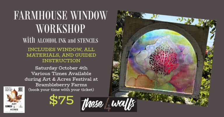 Join us on Saturday, October 4th at Brambleberry Farms during the Art & Acres Festival, hosted by These 4 Walls Gallery, for a one-of-a-kind farmhouse window workshop. Using vibrant alcohol inks and beautifully detailed stencils, you’ll transform a rustic farmhouse window into a radiant work of art that captures light like stained glass but much easier, with a fresh, modern twist.