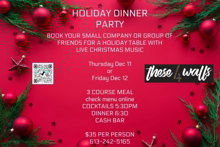 Looking for a venue for your small office or group of friends? Don’t want to book a restaurant? Well look no further. These4walls gallery has just the event and space for you. Come and enjoy a 3-course meal while listening to holiday live music in a beautiful gallery setting. Please select the menu options you would like when booking your seats. Tables will be exclusive based on the time of booking and not shared with other guests who are not part of your group. Two dates to choose from, be sure you’re purchasing the correct date. Select your menu choices for your guests when buying tickets (for example, vegan), we accommodate allergies by calling 613-242-5165 at least 24 hours in advance.