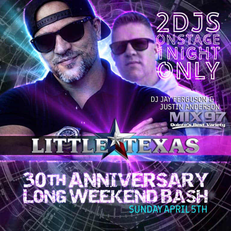 Our Long Weekend Anniversary Celebration Completes with a BANG as MIX97fm’s JUSTIN ANDERSON Makes a Triumphant Return to the Stage with Belleville’s Elite DJ Jay Ferguson, in what promises to be a Night to Remember!! Ticket Giveaways for Toronto Maple Leafs vs Dallas Stars!