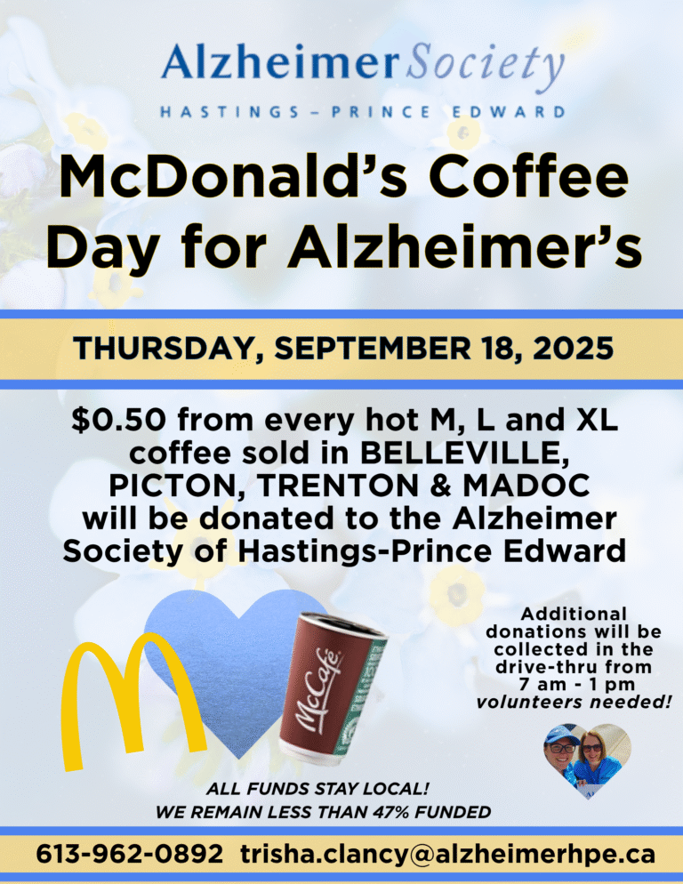 On Thursday, September 18, 2025 – make your coffee count! September is World Alzheimer Month. Local McDonald’s in Belleville, Quinte West, Picton and Madoc will be donating 50 cents from all medium, large, and extra-large hot coffees sold on Thursday, September 18th to the Alzheimer Society of Hastings-Prince Edward (ASHPE). In addition, staff, volunteers, and community supporters will once again be in the drive-thru collecting cash and tap donations. As always, all funds raised will stay LOCAL and help us support the estimated 5000+ people living with dementia in our region. To volunteer or learn more please contact us at 613-962-0892 or visit www.alzheimer.ca/hpe.