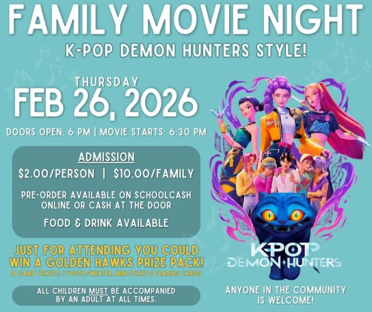 Lights down, volume up, and get ready for a high energy movie night packed with action, music, and demon slaying fun! Join us at Trent River Public School for a special screening of K-Pop Demon Hunters, a crowd favorite that brings together fierce performances, friendship, and epic battles.