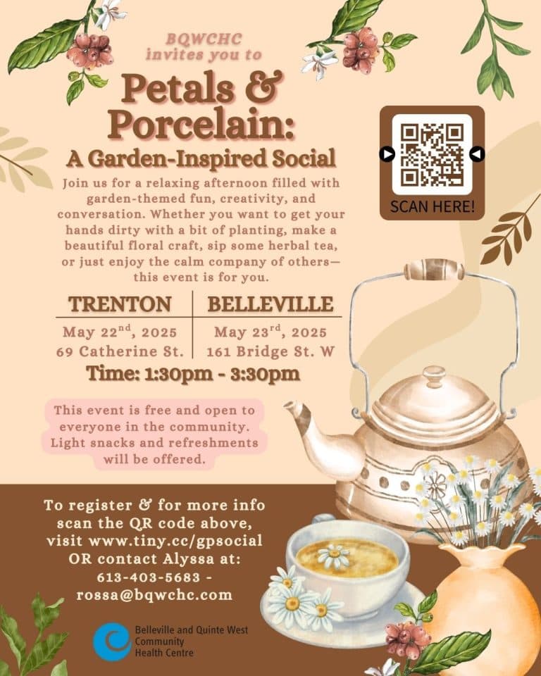 Join us at Belleville and Quinte West Community Health Centres for a relaxing afternoon of Petals and Porcelain: A Garden-Inspired Social, filled with garden-themed fun, creativity, and conversation. Whether you want to get your hands dirty with a bit of planting, make a beautiful floral craft, sip some herbal teas, or just enjoy the calm company of others—this event is for you.