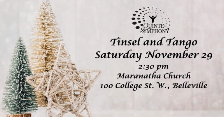 Quinte Symphony presents “Tinsel and Tango” a feast of Christmas treats for your ears. From Tchaikovsky’s Nutcracker and Anderson’s perennial favourite “Sleigh Ride” to Piazzolla’s Libertango and Rimsky-Korsakov’s Christmas Eve Suite.
