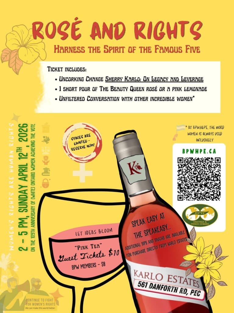 Harness the Spirit of the Famous Five. Join us on this anniversary of (white) Ontario women achieving the vote in 1917 to speak easy at the Karlo Estates’ speakeasy. Tickets are $10 (guests) or $8 (BPW members) and include uncorking change: hearing from Sherry Karlo on Legacy and Leverage. You also get one complimentary short pour of The Beauty Queen Rosé or a bottle of pink lemonade AND unfiltered conversation with other incredible women (all women are women). Additional sips and snacks are available for purchase directly from Karlo Estates. Tickets are limited, so don’t delay!