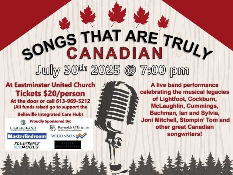 Wild Pines band consisting of Tony Vani, Michael Kelly, Renee Toms, Matt Smith, Jeanette Arsenault, and Dale Lloyd will be performing Canadian Folk Classics at Belleville Eastminster Church. They will help raise funds in support of Belleville Integrated Care Hub. Bridge Integrated Care Hub is a low-barrier initiative led by a collaborative partnership of local health and social service organizations committed to supporting individuals experiencing homelessness and other vulnerable populations