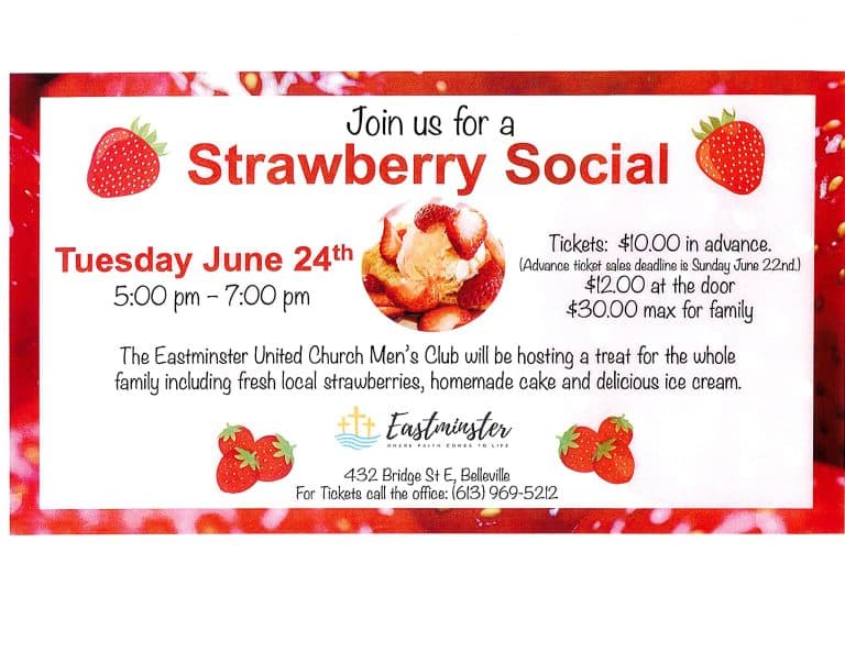 The Eastminster’s United Church Men’s Club will be hosting a treat for the whole family, including fresh local strawberries, homemade cake and delicious ice cream on Tuesday, June 24, 2025 from 5 – 7 pm. Tickets are $10.00 in advance until June 22, 2025, $12.00 at the door, $30.00 max. for a family. For tickets, please call the church office at 613-969-5212.