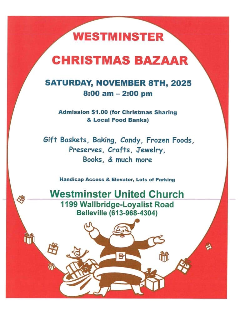 Westminster United Church, 1199 Wallbridge Loyalist Rd. in Belleville is having their annual Christmas Bazaar on Saturday, November 8th, 2025 from 8:00am-2:00pm.