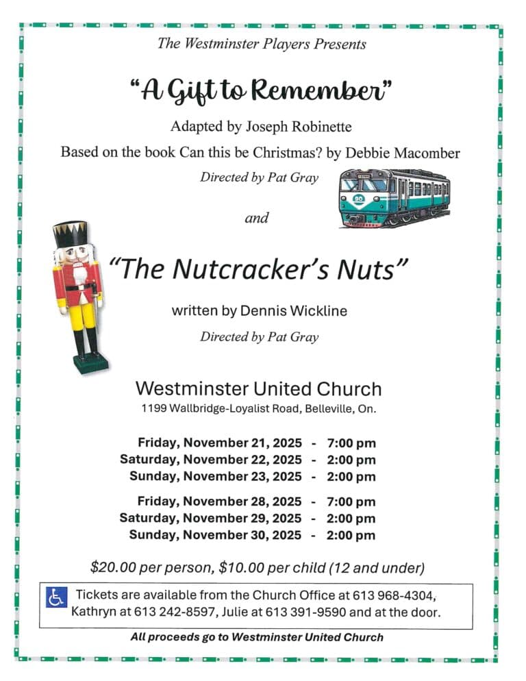 2 Plays, “A Gift to Remember” and “The Nutcracker’s Nuts” will be happening at Westminster United Church, 1199 Wallbridge Loyalist Road, Belleville, ON, K8N 4Z5 on each of the following dates: