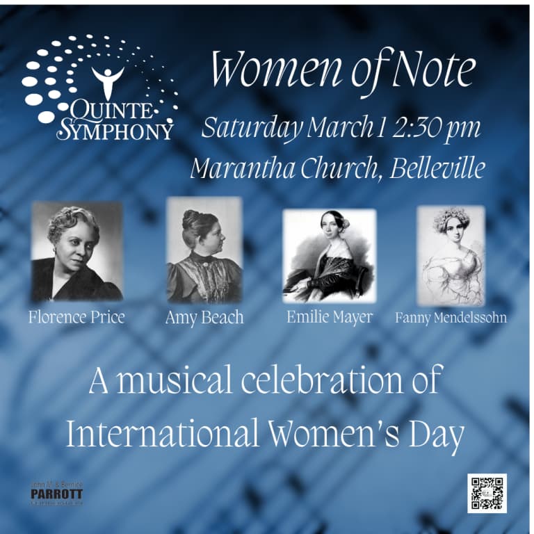 Celebrate International Women’s Day with Quinte Symphony! Join us for an exciting performance featuring music by trailblazing women composers. Experience their powerful melodies and bold harmonies. Visit thequintesymphony.com for ticket purchase options.