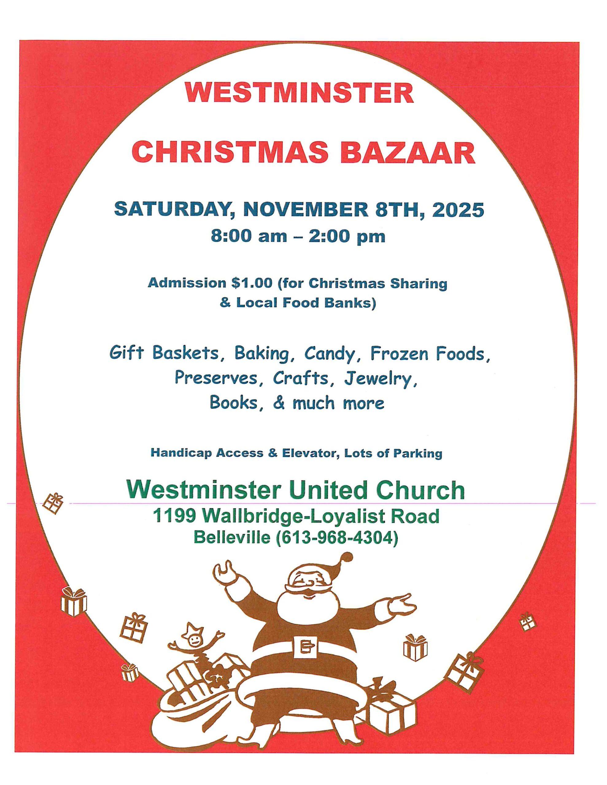 Westminster United Church, 1199 Wallbridge Loyalist Rd. in Belleville is having their annual Christmas Bazaar on Saturday, November 8th, 2025 from 8:00am-2:00pm. Admission is 1.00 (for Christmas Sharing & Local Food Banks) Gift Baskets, Baking, ...