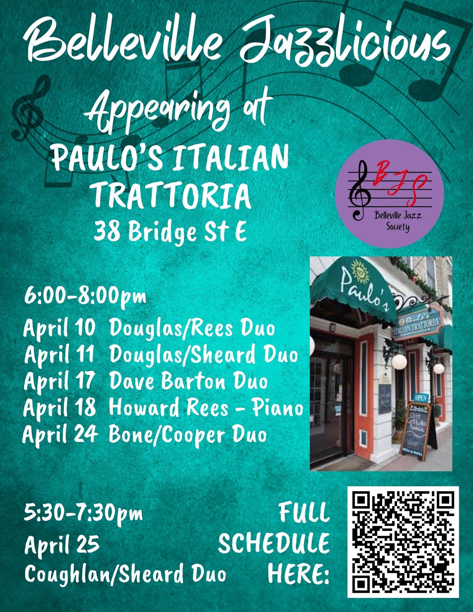 Jazzlicious 2026 continues with Dan Douglas and Gord Sheard at Paulo's from 6-8 PM. Great food and live jazz!