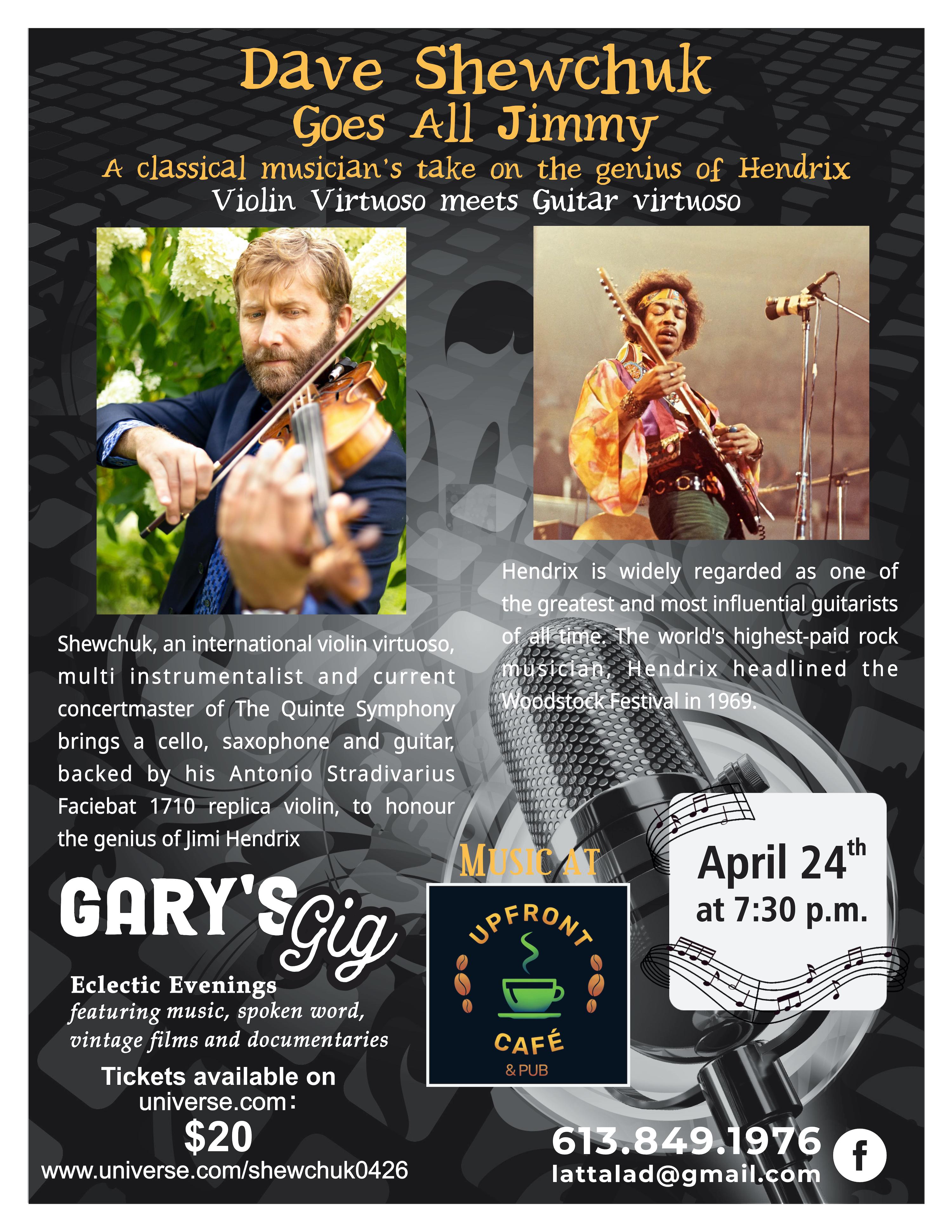 Violin virtuoso, Dave Shewchuk, will interpret the work of Jimi Hendrix, the third in a trilogy of his takes on world-renowned musicians: The Beatles, The Rolling Stones and now Hendrix. Dave incorporates a cello, a ...