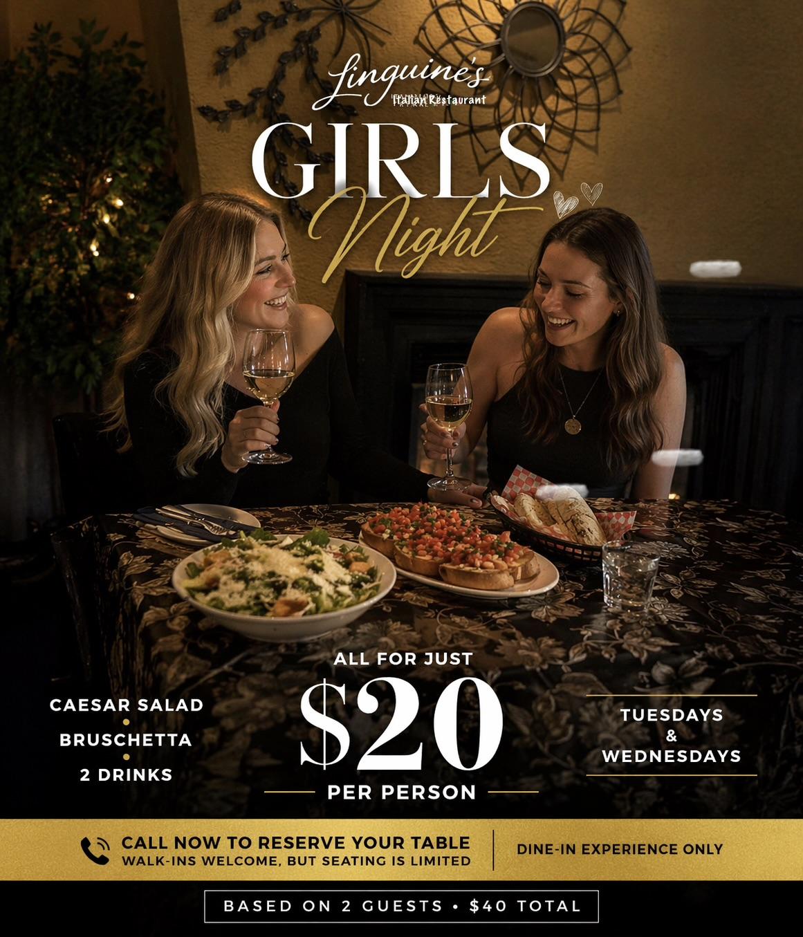 Girls Night at Linguine’s Enjoy a cozy night out with: Caesar Salad Bruschetta Drinks Included All for just $20 per person Every Tuesday & Wednesday Call now to reserve your table Walk-ins welcome, but seating ...