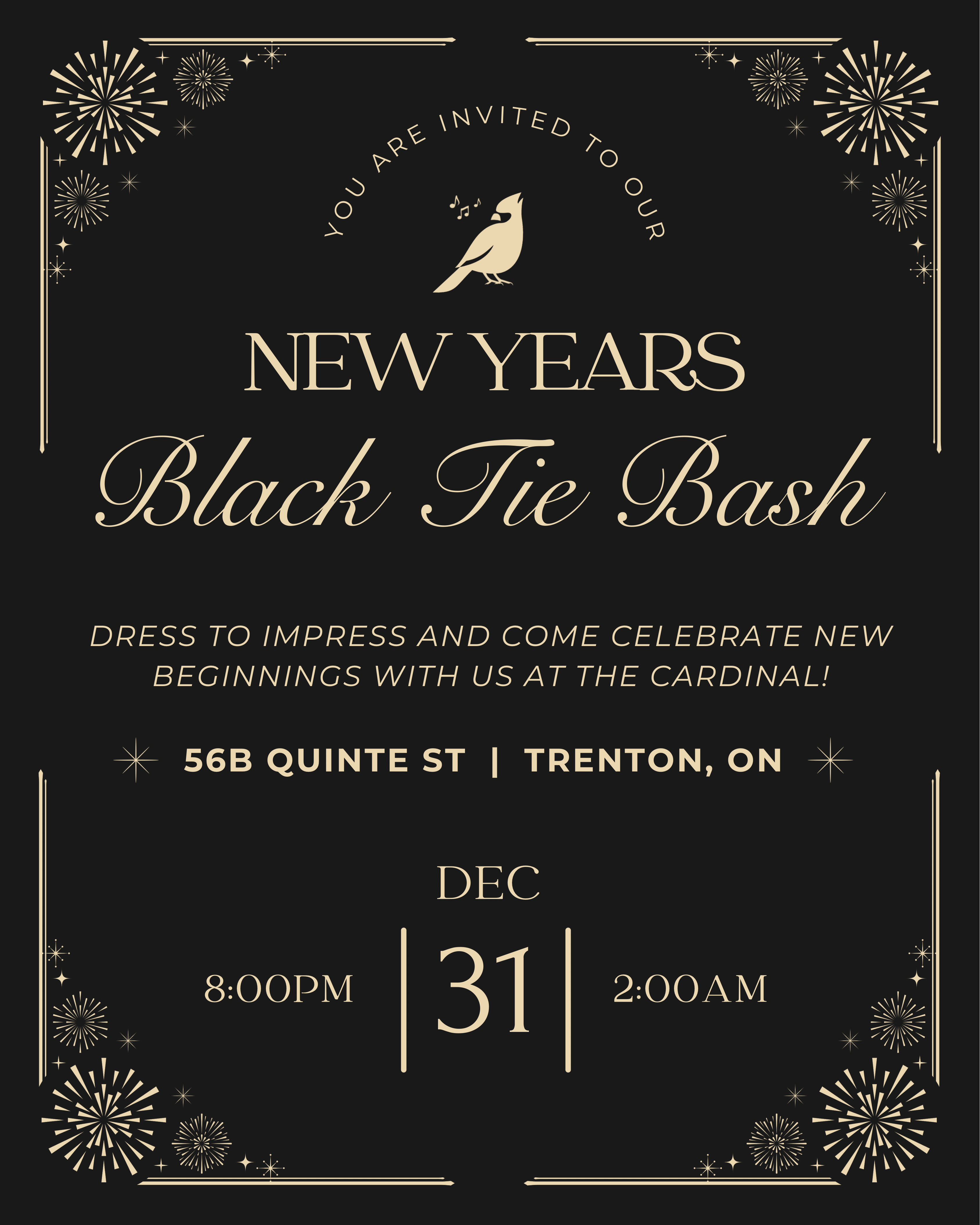 You’re invited to our New Year’s Eve Black Tie Bash Dress in your best formal wear and join us at The Cardinal to ring in 2026 in style! • No cover • 19+ event