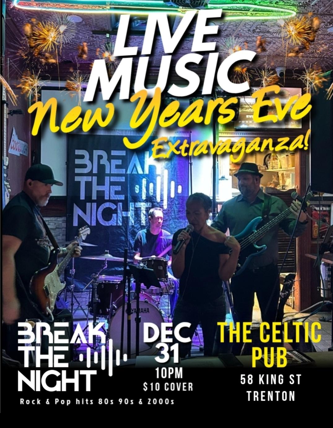Come celebrate NYE 2026 with live music by local band Break the Night at the Celtic Pub downtown Trenton. Cover $10 per person. Dec 31. Band goes on at 10pm.