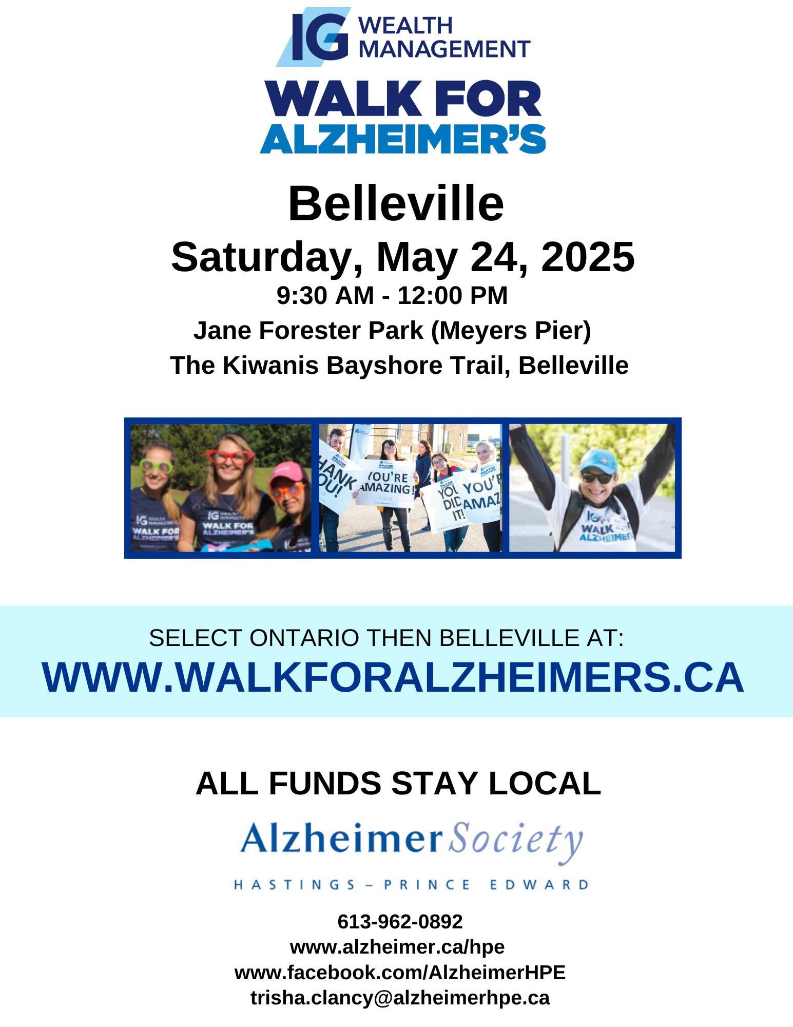 Join us for the Belleville IG Wealth Management Walk for Alzheimer's on Saturday, May 24th at Jane Forrester Park, walking the Bayshore Trail. Registration opens at 9:30 am and the Walk is from 10 am - 12 pm. Everyone welcome to attend this free public community event. No cost to attend or participate. Register and fundraise online at www.walkforalzheimers.ca or learn more at www.alzheimer.ca/hpe. Other Walk events: Quinte West (May 24 - Centennial Park), PEC (May 24 - Macaulay Heritage Park), Bancroft (May 25 - Millennium Park), Tweed (May 25 - Tweed Fairgrounds), and Brighton (May 25 - Ontario St Boat Launch). All walks are from 10 am - 12 pm. Find your community at www.walkforalzheimers.ca .