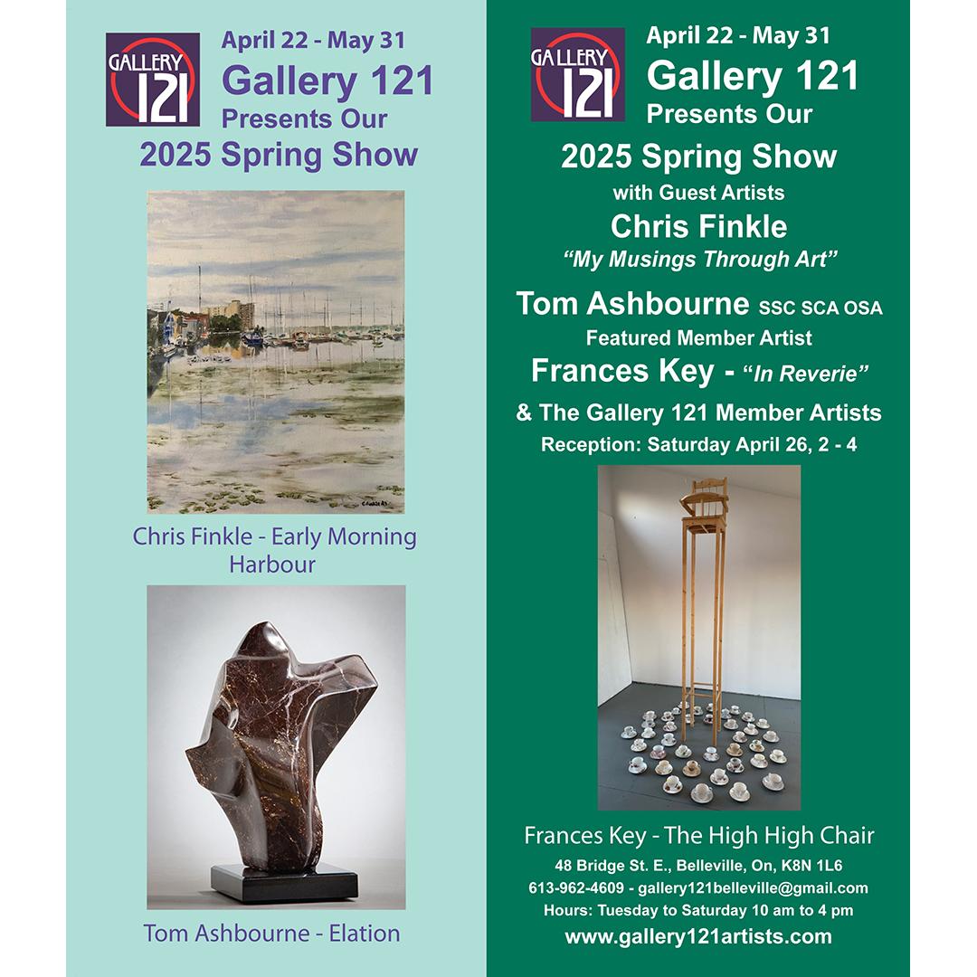 Gallery 121 members are pleased to invite you to view our Spring Show running April 22nd until May 31st Our guest artists are Chris Finkle with his oil paintings in "My Musings Through Art," and Tom Ashbourne with his sculptures in "Elation," exploring the essence of the stone. Visit the New Show in the gallery or on the website.