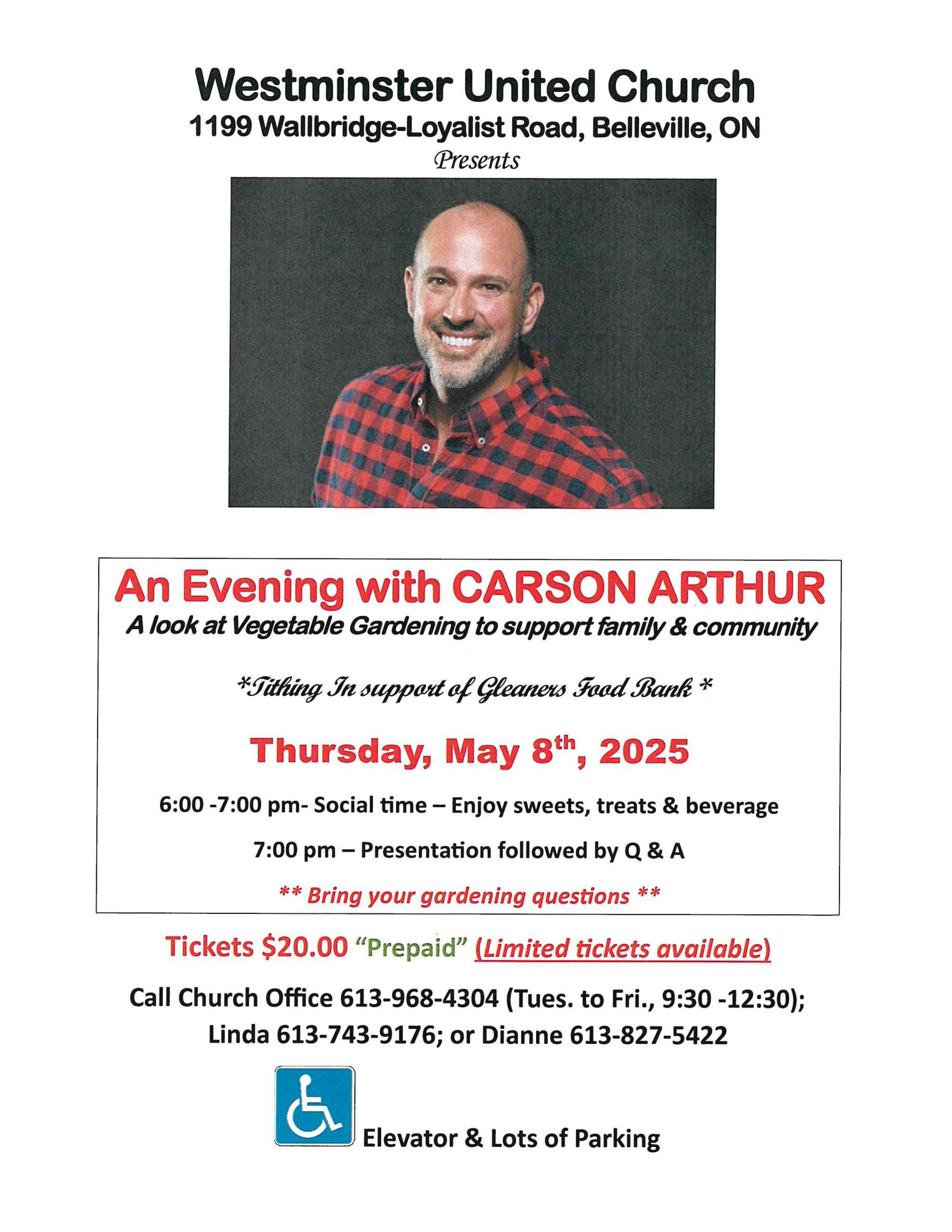 An Evening with Carson Arthur to look at Vegetable Gardening to support family and community on Thursday, May 8th, 2025.