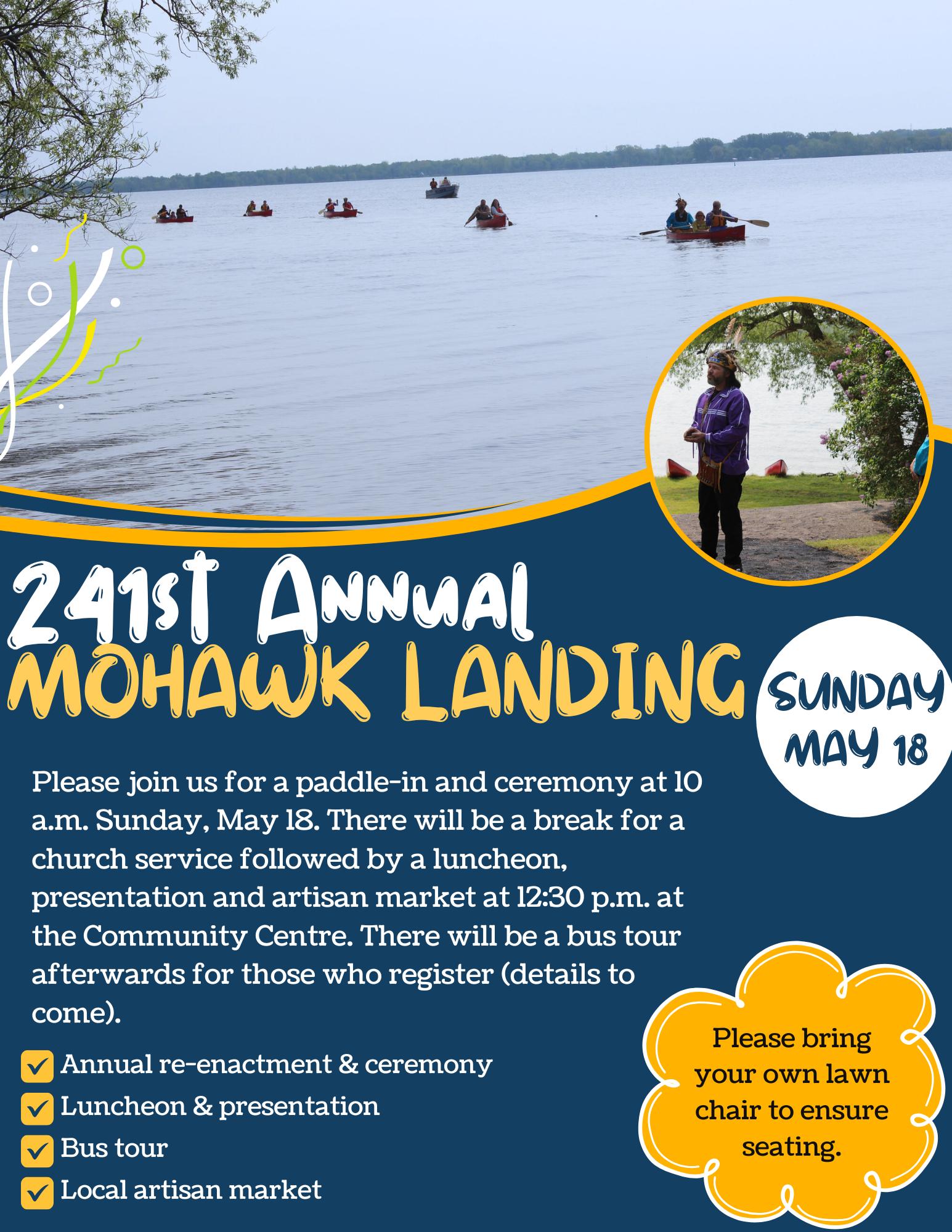 Please join us for a Mohawk Landing paddle-in and ceremony at 10 a.m. Sunday, May 18. There will be a break for a church service followed by a luncheon, presentation and artisan market at 12:30 p.m. at the Community Centre. There will be a bus tour afterwards for those who register.