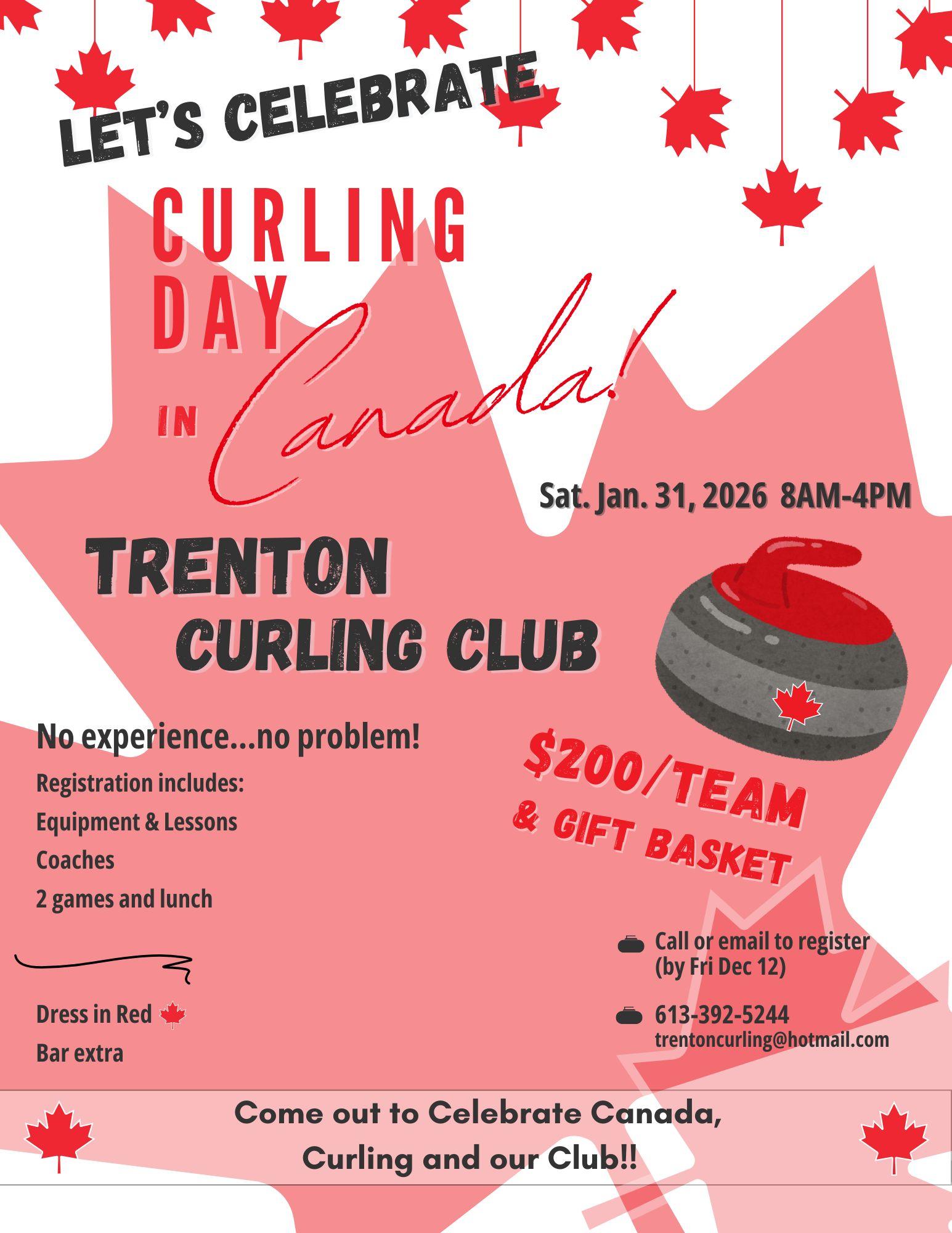 Curling Day in Canada Funspiel 2026! at the Trenton Curling Club No Experience …No Problem! Equipment and lessons provided $200/Team (4) & a Gift basket Dress in Red !