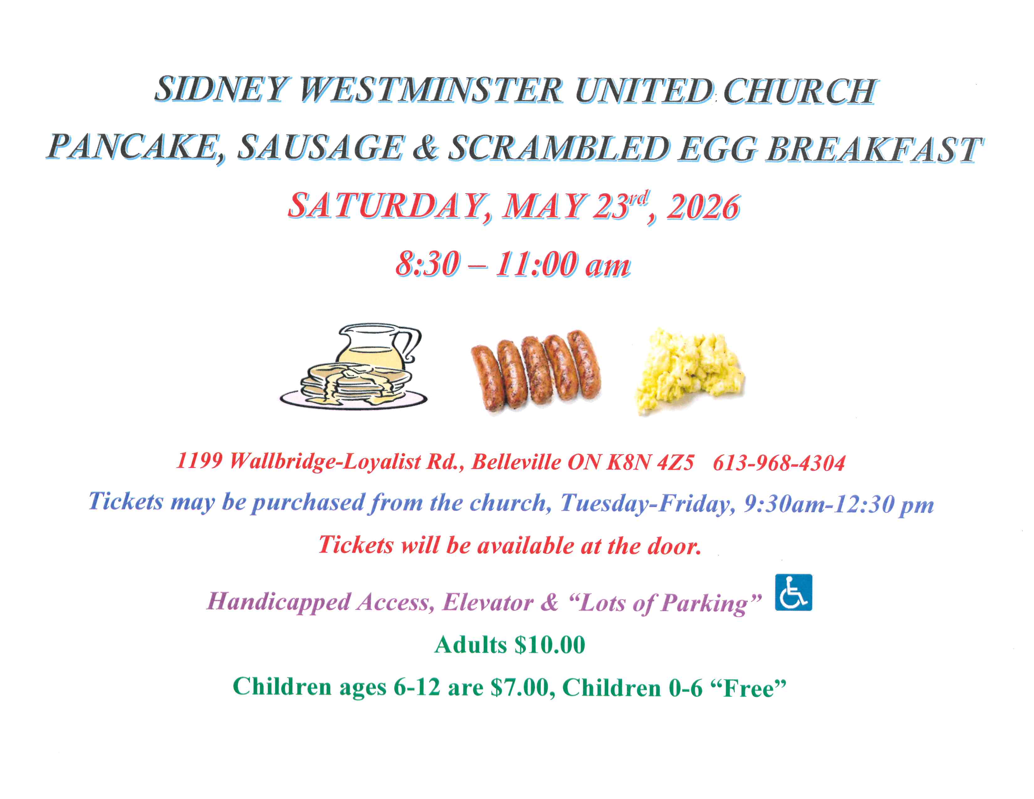Sidney Westminster United Church, 1199 Wallbridge Loyalist Rd. is having a Pancake, Sausage & Scrambled Egg Breakfast on Saturday, May 23rd, 2026, from 8:30 am-11:00 am. Tea, coffee and juice will be available.