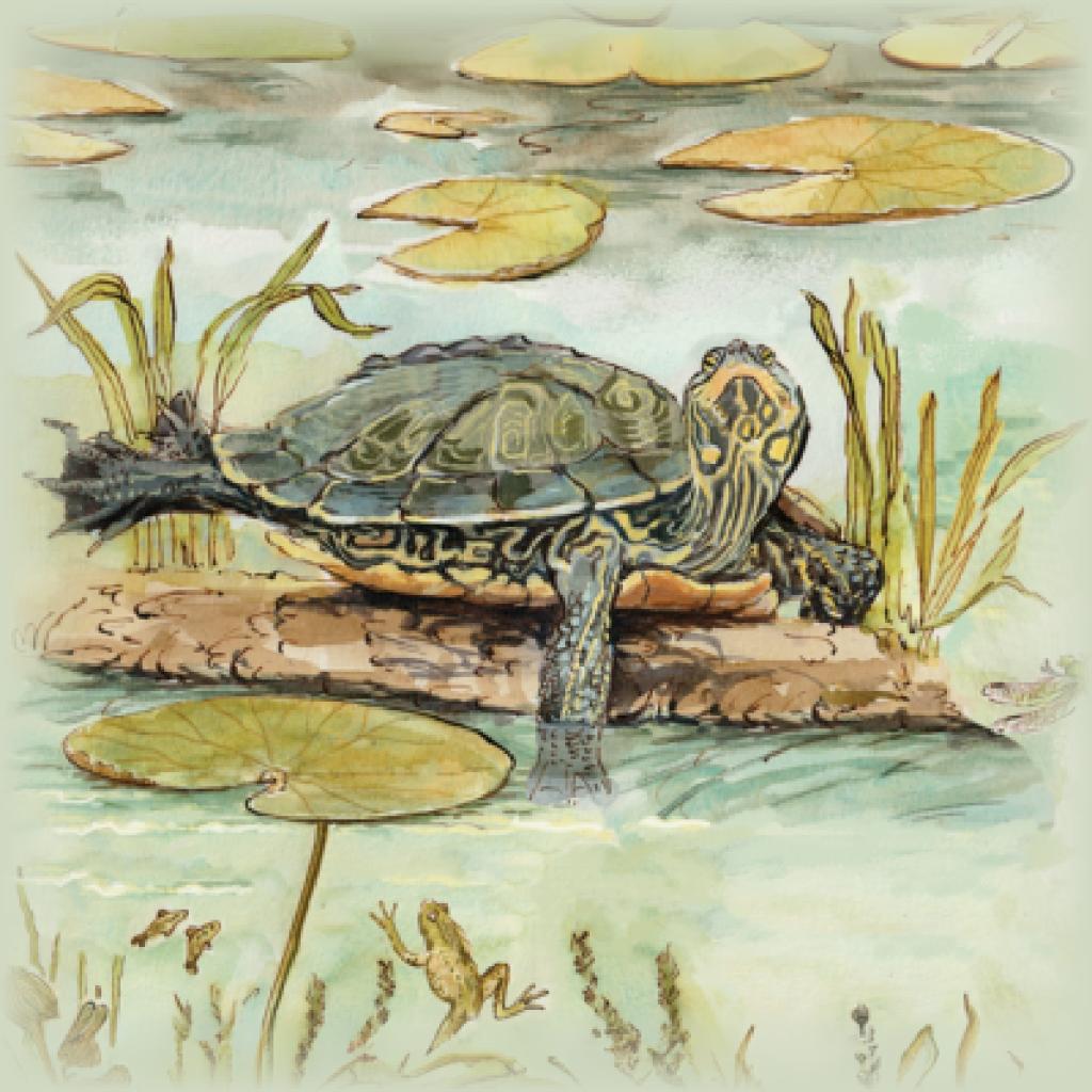 The Northern Map turtle gets its name from its shell’s map-like patterns, which help it blend in with its freshwater home—whether it’s a river or a lake. Females are noticeably larger than males, often growing nearly twice their size, with powerful jaws built for crushing mollusks, including the invasive zebra mussel.